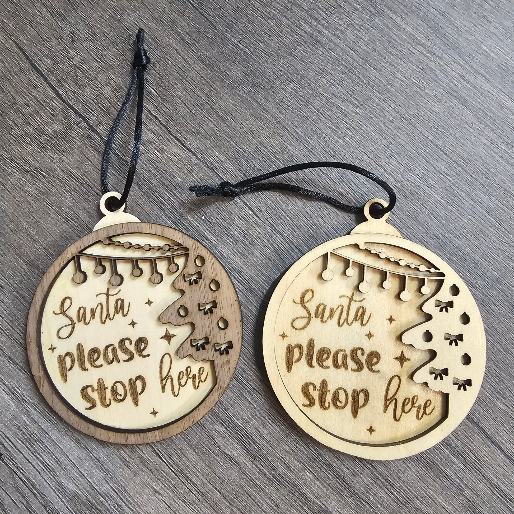 This charming wooden ornament brings holiday humor to your tree with its cheeky "Santa Please Stop Here" message. Crafted from quality wood with a natural finish, it's the perfect tongue-in-cheek gift for anyone who loves a good laugh during the season. Whether you're decorating your own home or giving it to a friend with a sense of humor, this ornament adds personality and warmth to your festive display. A delightful way to remind Santa where the real magic happens—your house!
